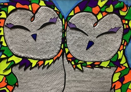 今の会社に入社して初めて制作した貼り絵作品です。ボール紙をハサミや一穴パンチでくり抜き、パーツを組み合わせることで、メインモチーフであるフクロウを形作りました。