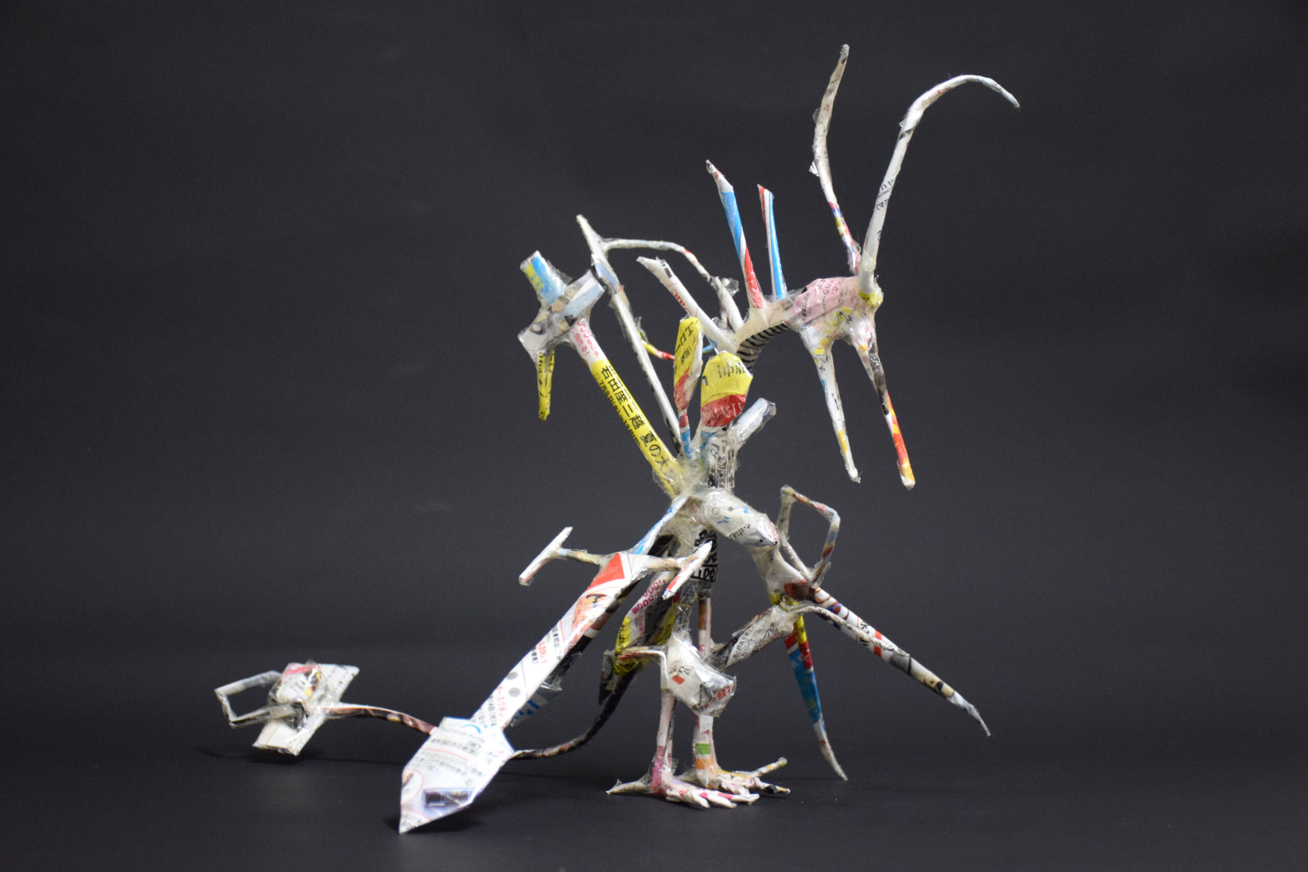 最近では、発泡スチロールの球体をベースにした奇妙なフォルムの作品や、内面世界にまつわる神話を表現した群像など、ますます思考とイマジネーションの幅が広がりを見せている。以前は1体作るのに1週間ほどかかっていたが、コロナ禍で家にこもっている間にアイデアが次々と浮かび、制作スピードが速くなったという。およそ1日半で1体、時には1日で3体仕上げることもある。1か月に約40体。これからの展開がますます楽しみだ。
