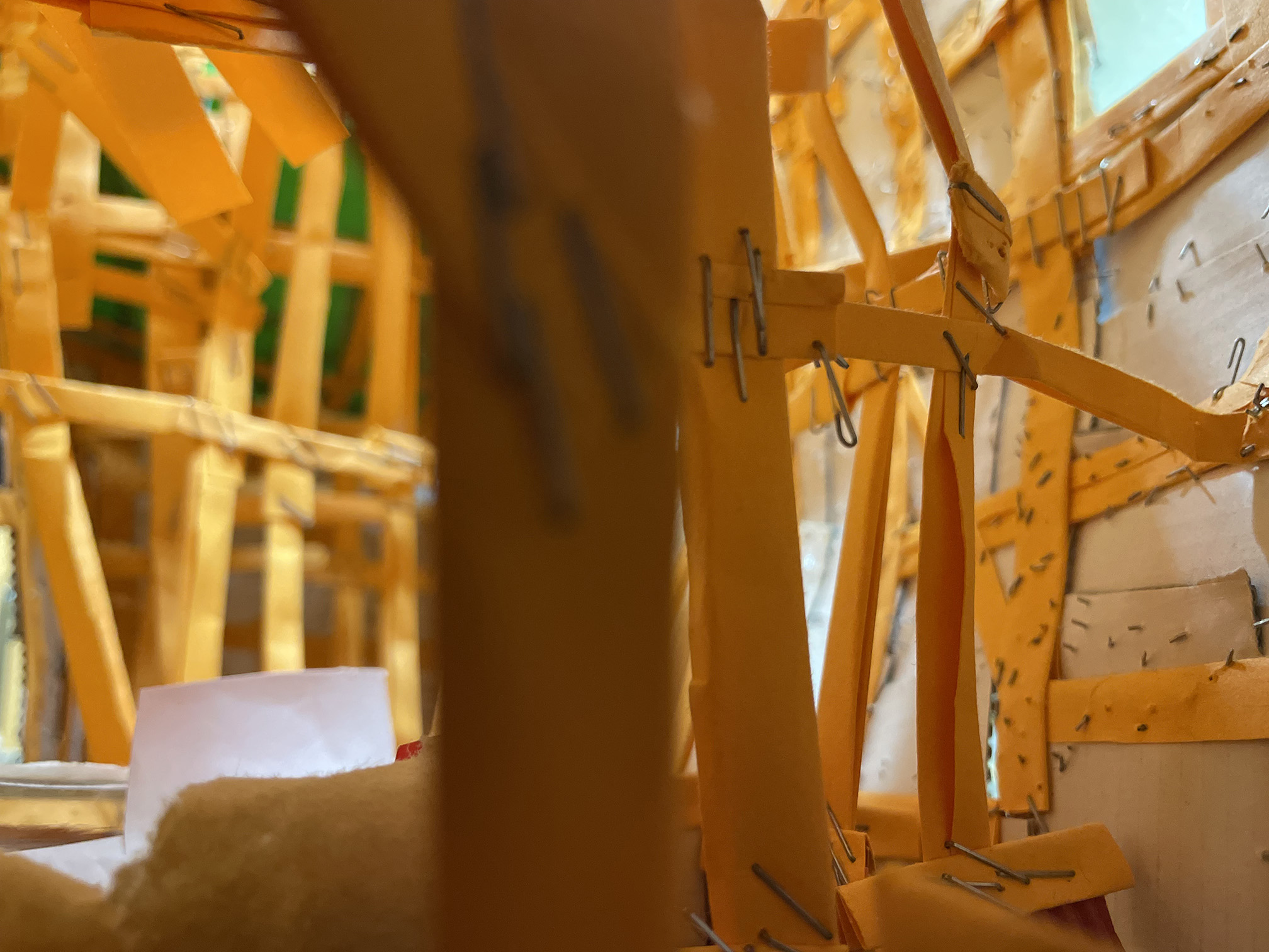 後藤の作品のタイトルはすべて「家」。今回メインで紹介した作品《家》は、じつはまだ完成していない未完成のもの。完成してしまうと内部の構造やプロセスが分かりづらくなるので、制作途中ではあるが、許可を貰ってこの《家》を紹介することにした。後藤は2013年頃から家をモチーフに制作している。きっかけは自宅のリフォームだったという。家族が家づくりで話し合っていると興味をもち、建築の図面もよく見ていたそうだ。最初のころの作品は手近にあった紙類を使っていたが、やがて自分で材料を購入するようになる。まず土台になる紙に間取りの平面図を引き、全体の構造を考え強度のための柱を配置する。ホチキスの手法も自分で考案した。初期からみると家の完成度はかなり上がっている。