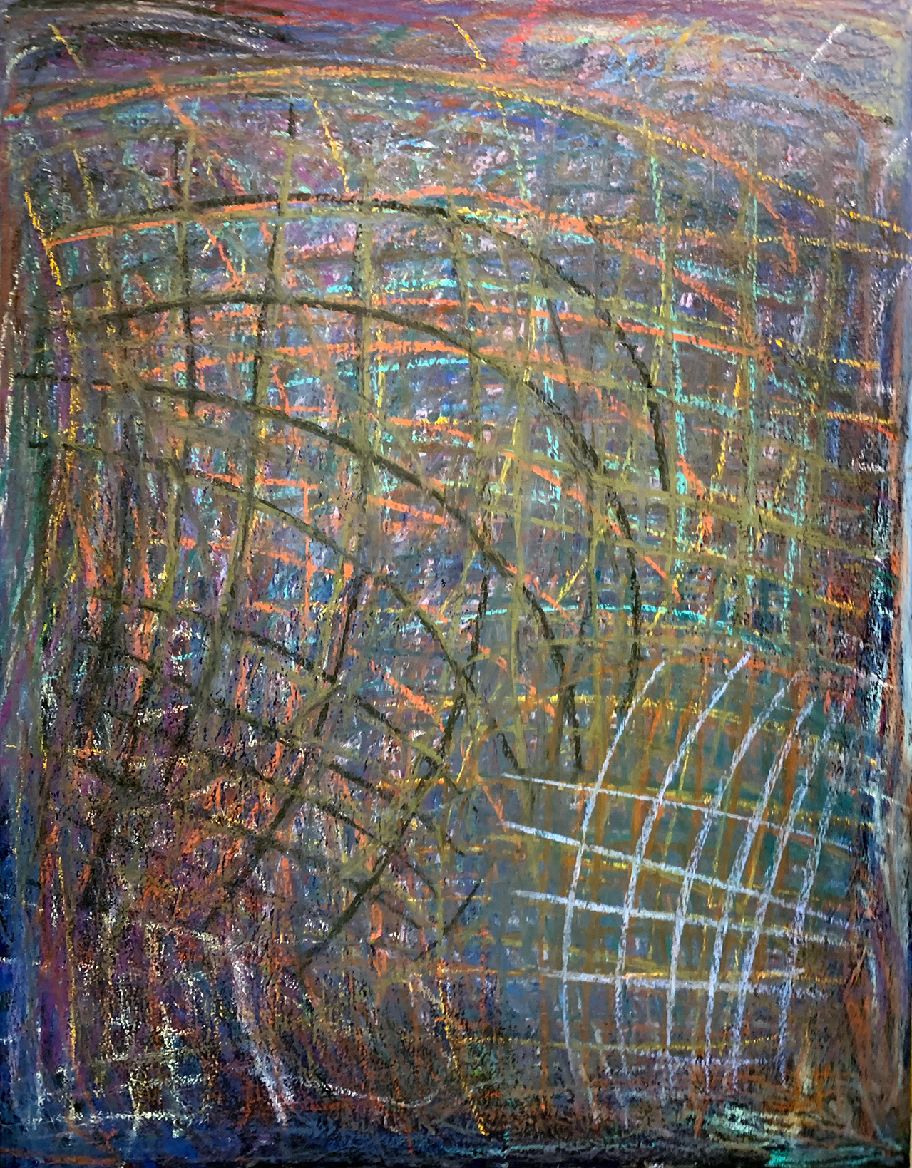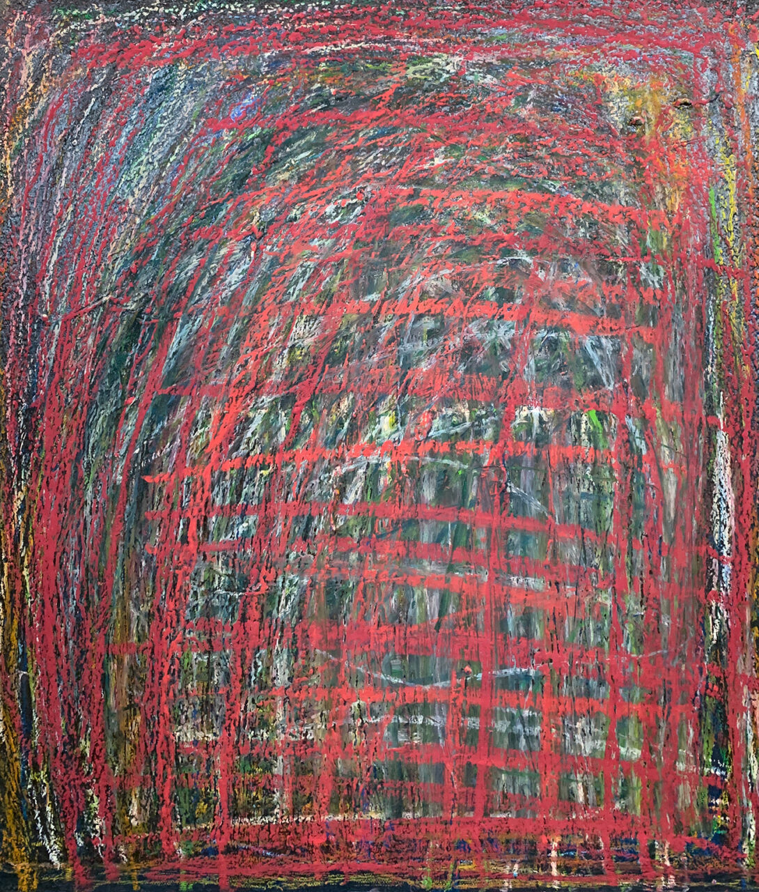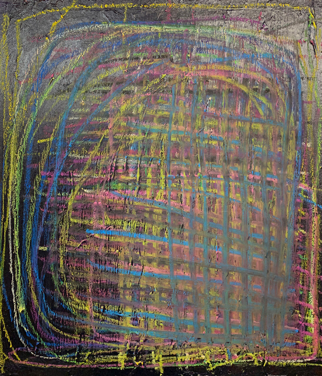 ライプハウス代表の大澤辰男さんは教室のファシリテーターでもある。ゆっくりキャンバスに向かうように、そして描き続けるようにと働きかけた。そうして少しずつ制作への取り組みが変化していく。絵具の匂い、キャンバスの弾力、オイルパステルの描き心地などが本人の感覚とマッチングがよかったのか、キャンバスにアクリル絵具とオイルパステルで描くのが面白くなる。自分で決めた色の絵具を一度に大量に出して描く。それからオイルパステルで垂直水平の線を描いていく。