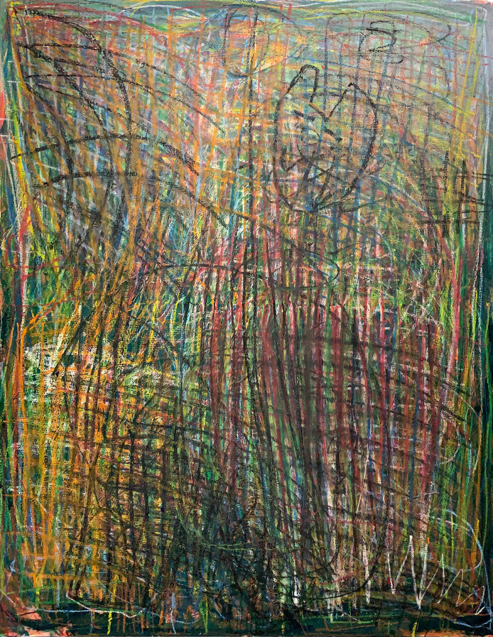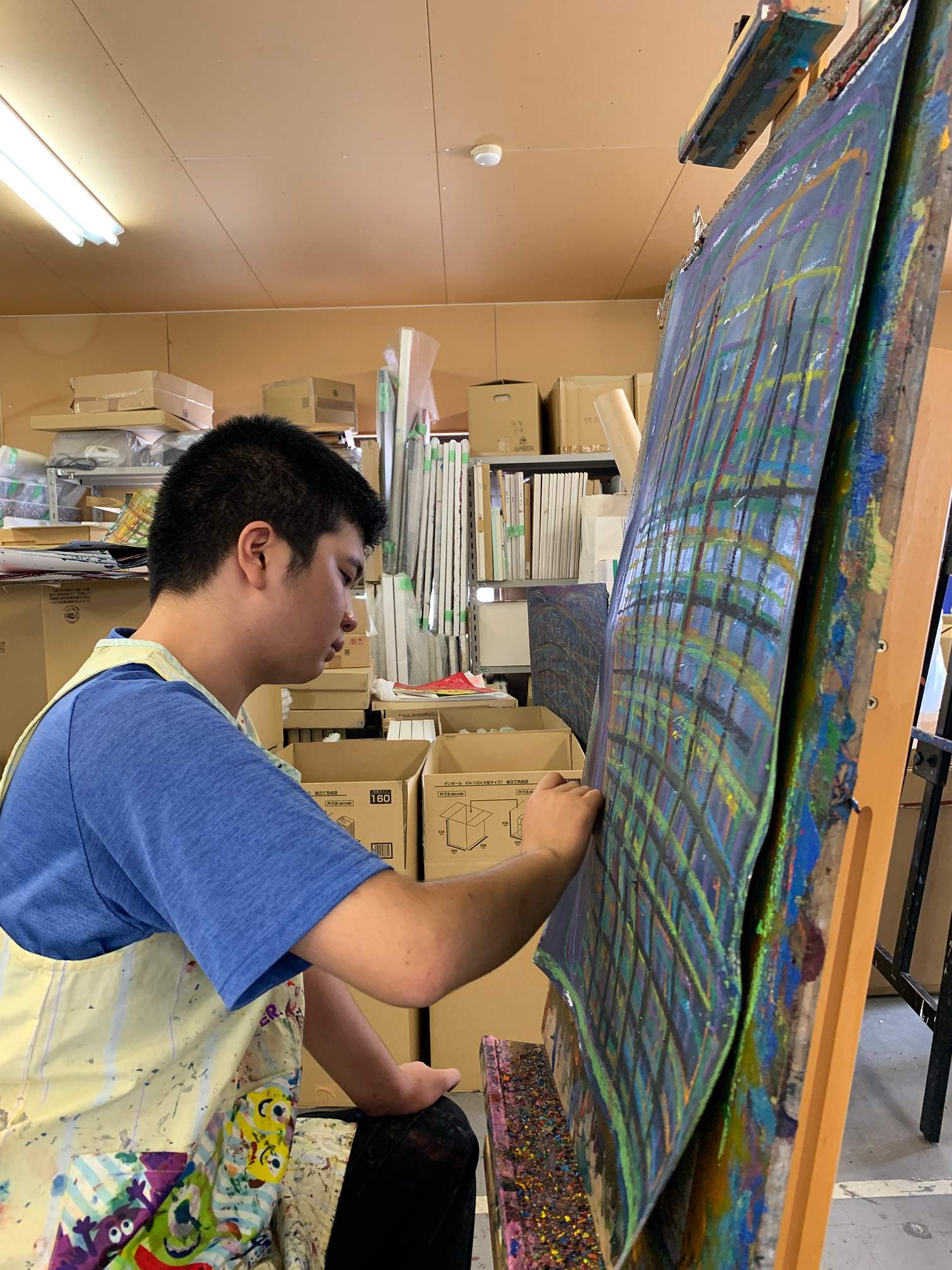 たくさんの線を素早く描く。アクリル絵具を塗った物質感のあるキャンバス画面にオイルパステルで力いっぱい描く。絵の出来上がり、終わりは自分で決めている。ときに加筆するようにアドバイスすることもあるが、少し描いて終わることが多い。本人の中ではじつはやっぱり終わっていたということなのだが、こういうコミュニケーションの積み重ね、声かけが変化を生んでいくのだと感じる。彼との言葉のコミュニケーションはほぼひと言ふた言で終わることが多いが、こちらが話すことはしっかりと理解している。