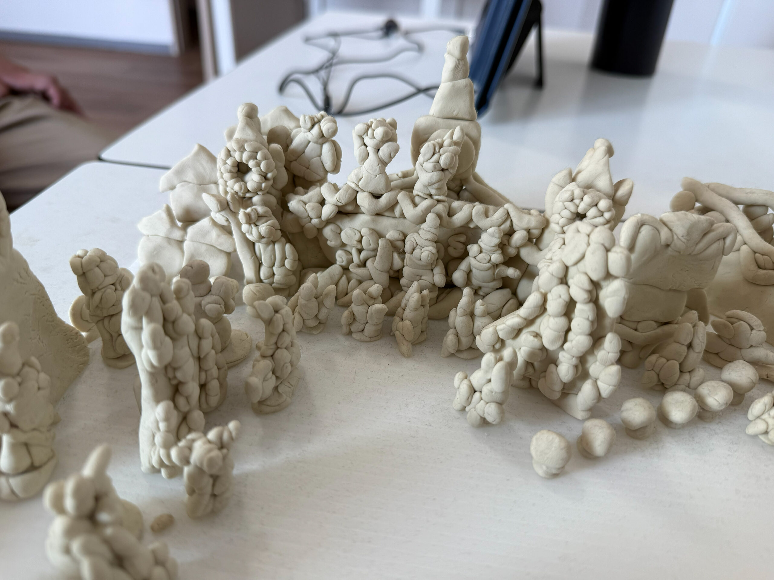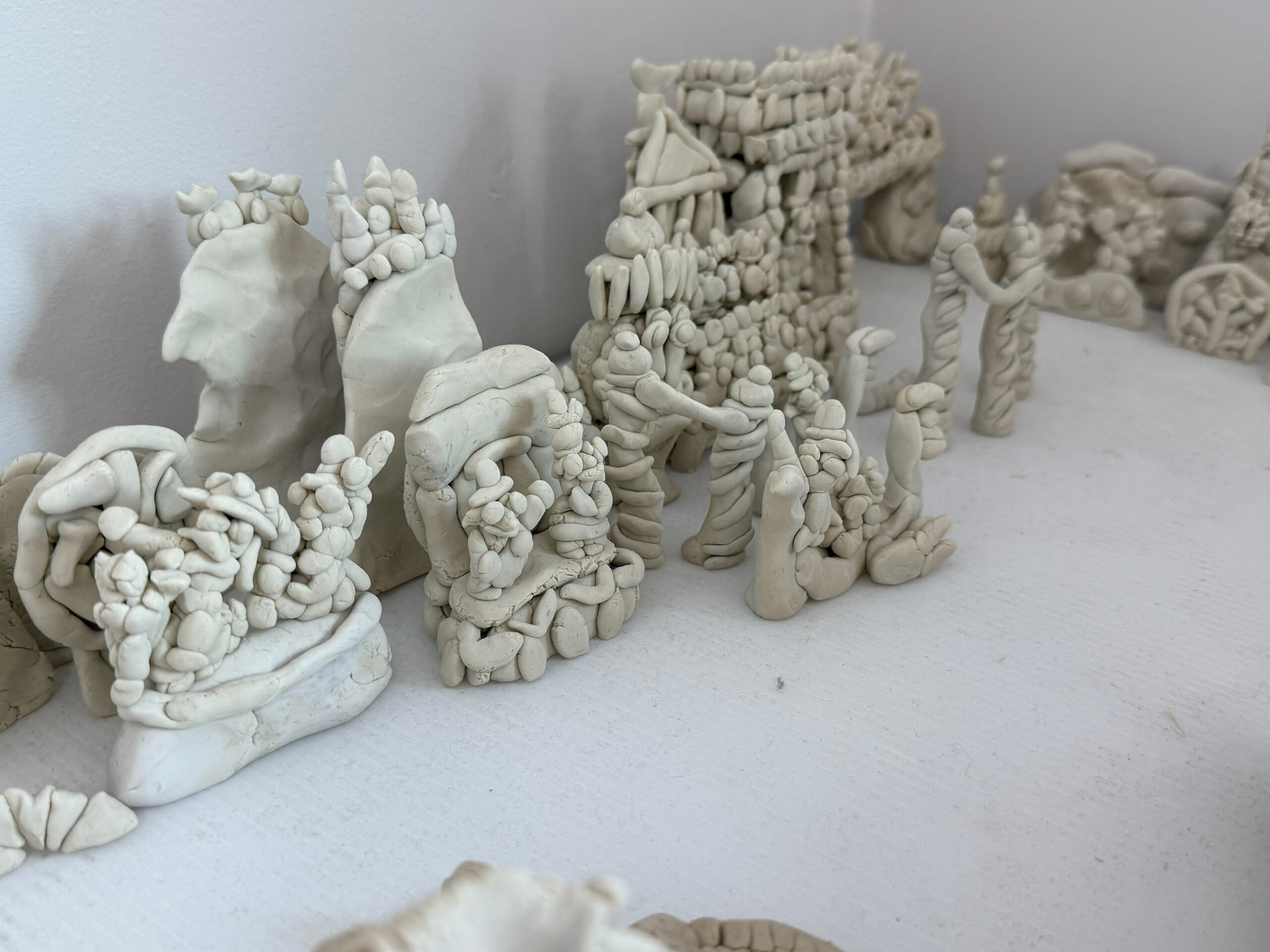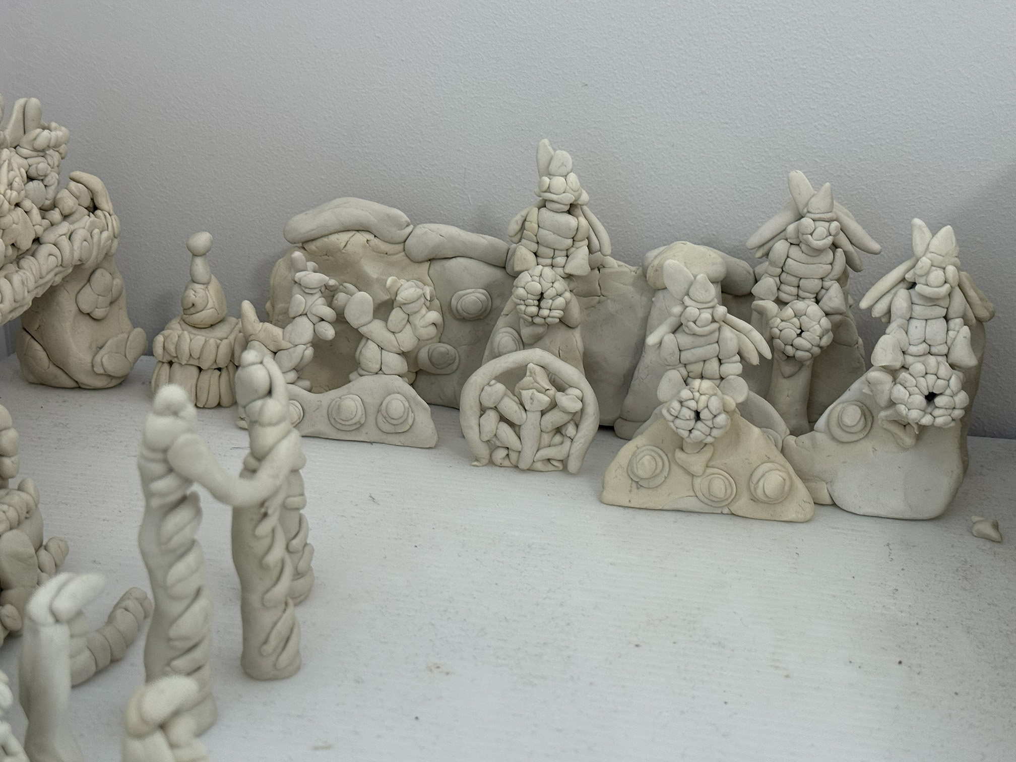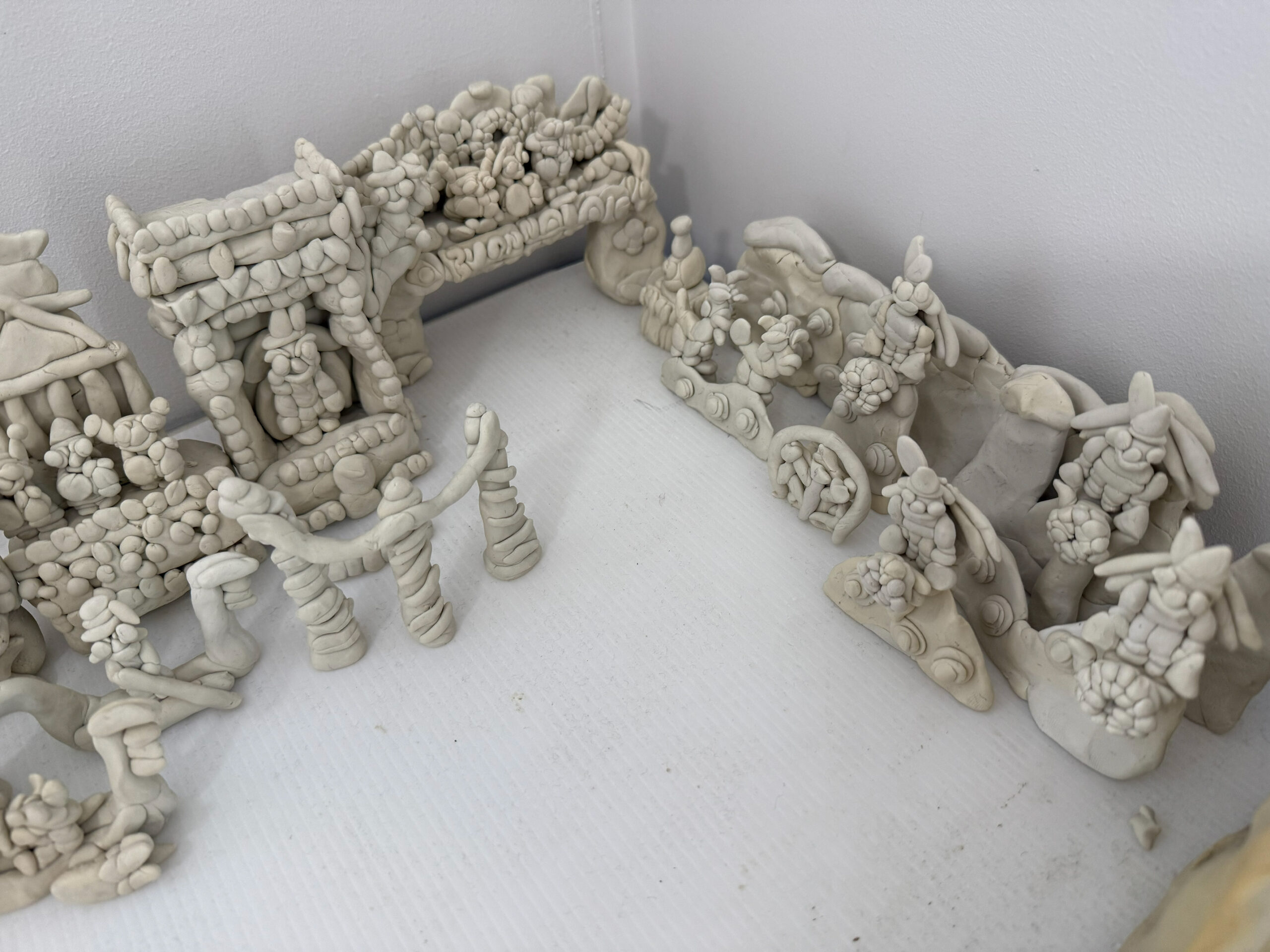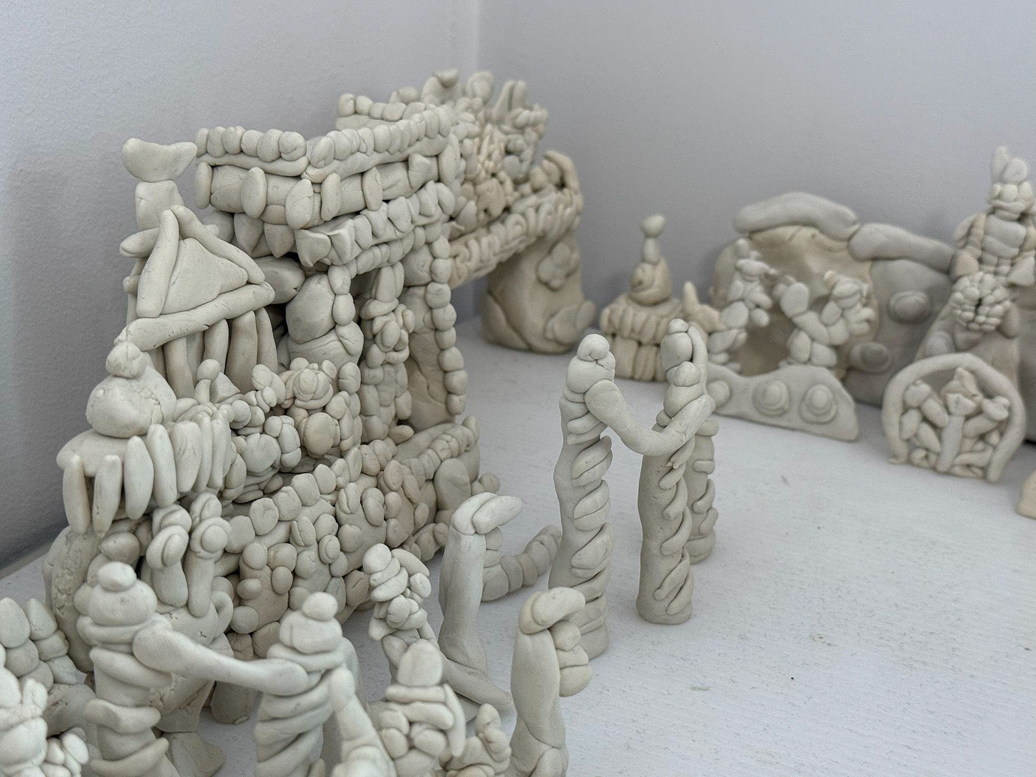 無彩色の粘土で構成された鈴木の作品は、見る人に色や音、光を想像させ、アトラクションの記憶を呼び起こします。「作品をつくる」というよりも、「好きなものを再現し続ける」こと。その思いつくようで思いつかない独自の創作は、同じものが二度と残らない、一瞬の体験として存在しています。