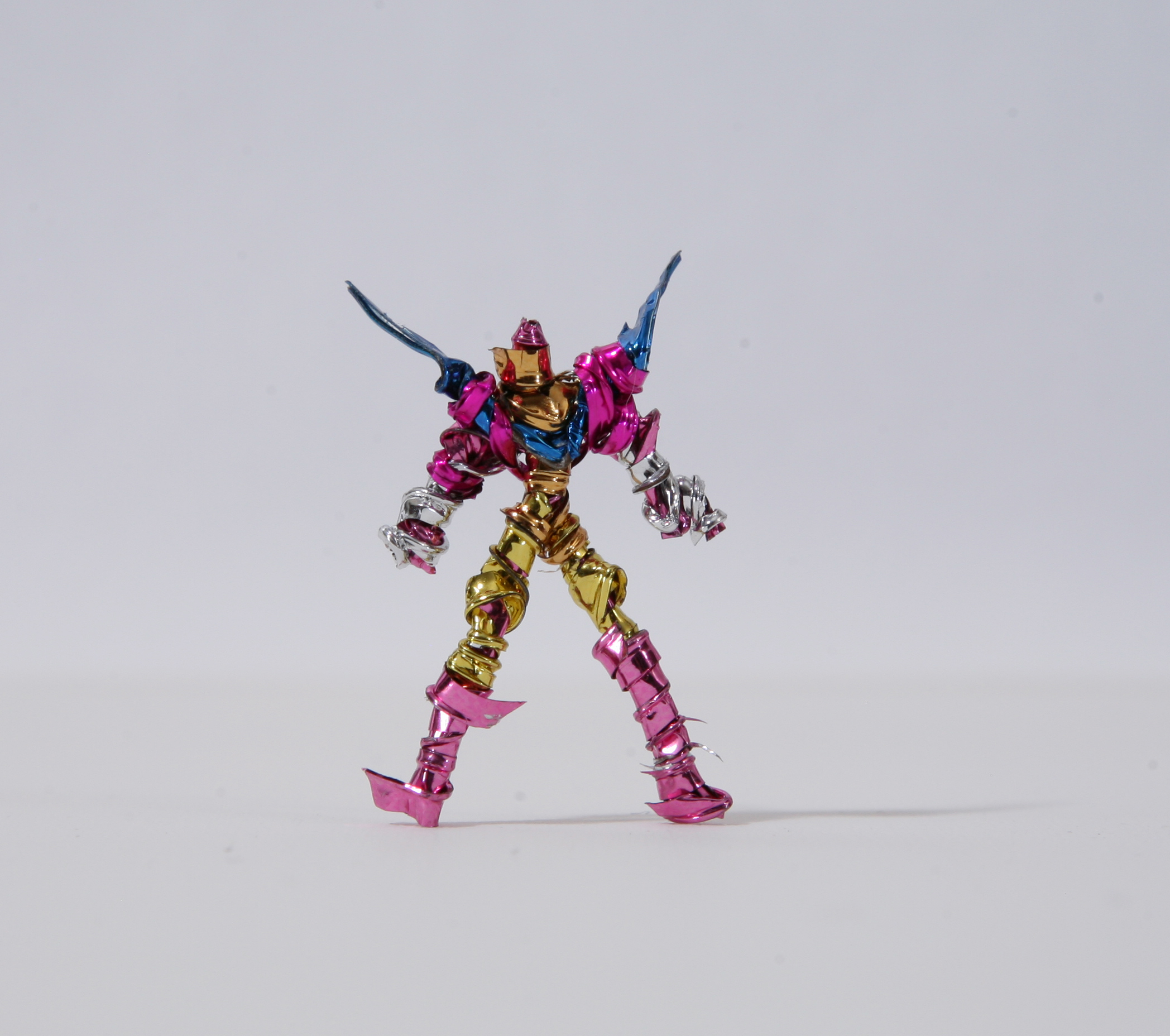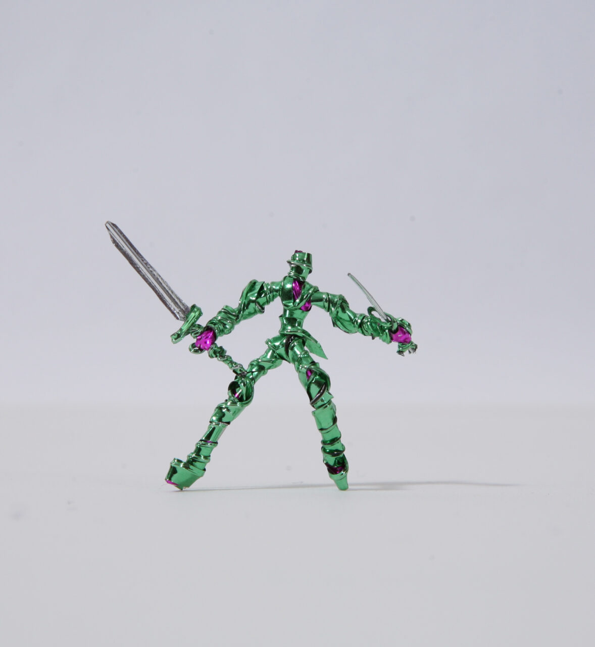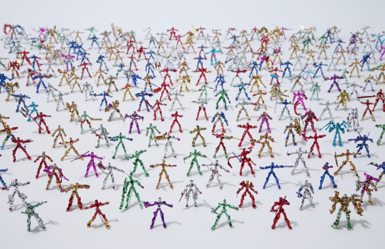 全体的な色合いはもちろん、顔や足、膝、手といった細部の配色にもこだわりが見られる。小さなハサミやニッパーを使い、数ミリ幅のアルミタイを細かく切り、折り曲げ、形を変えることで、武器の形状や戦士がまとう衣装に至るまで、一体一体に微妙な違いと豊かなバリエーションを生み出している。作品のサイズは、勝部にとっていちばん制作しやすい大きさが、結果としてこの極小スケールだったというだけだ。
