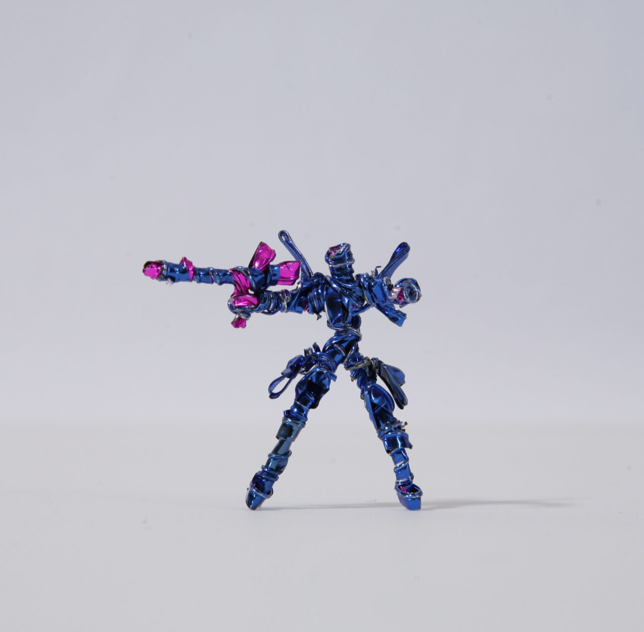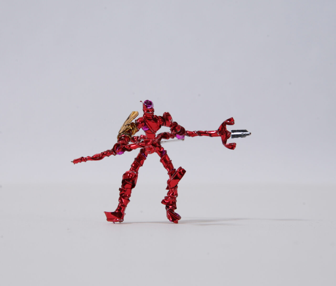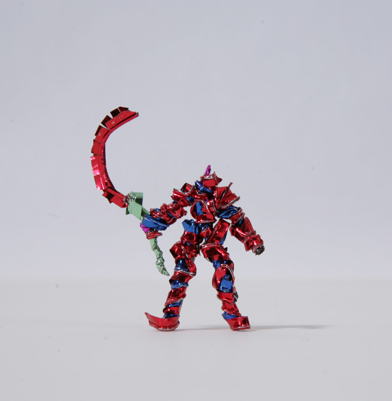 素材として用いられているのは、お菓子やパンの袋を留める際などに使われるアルミタイ。身近な素材を、思いもよらない方法で変換しながら、これまでに自宅で何百体もの戦士を生み出してきた。勝部の制作には、素材の特性を活かそうとする探求心と創意工夫が感じられる。