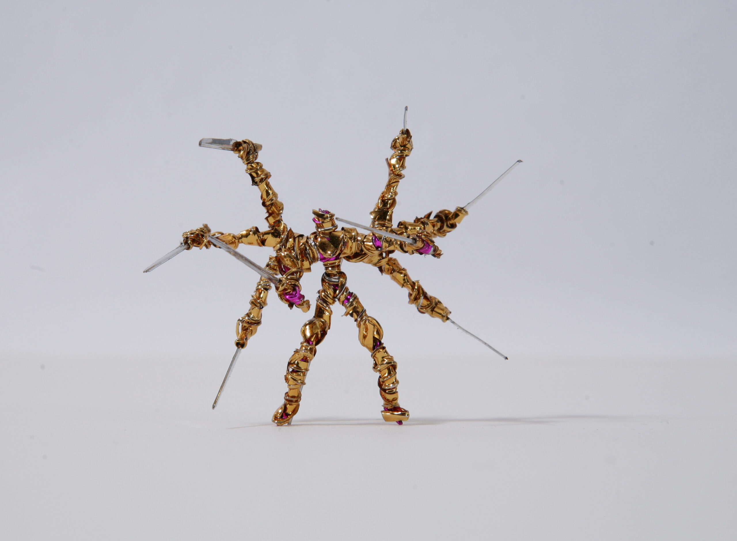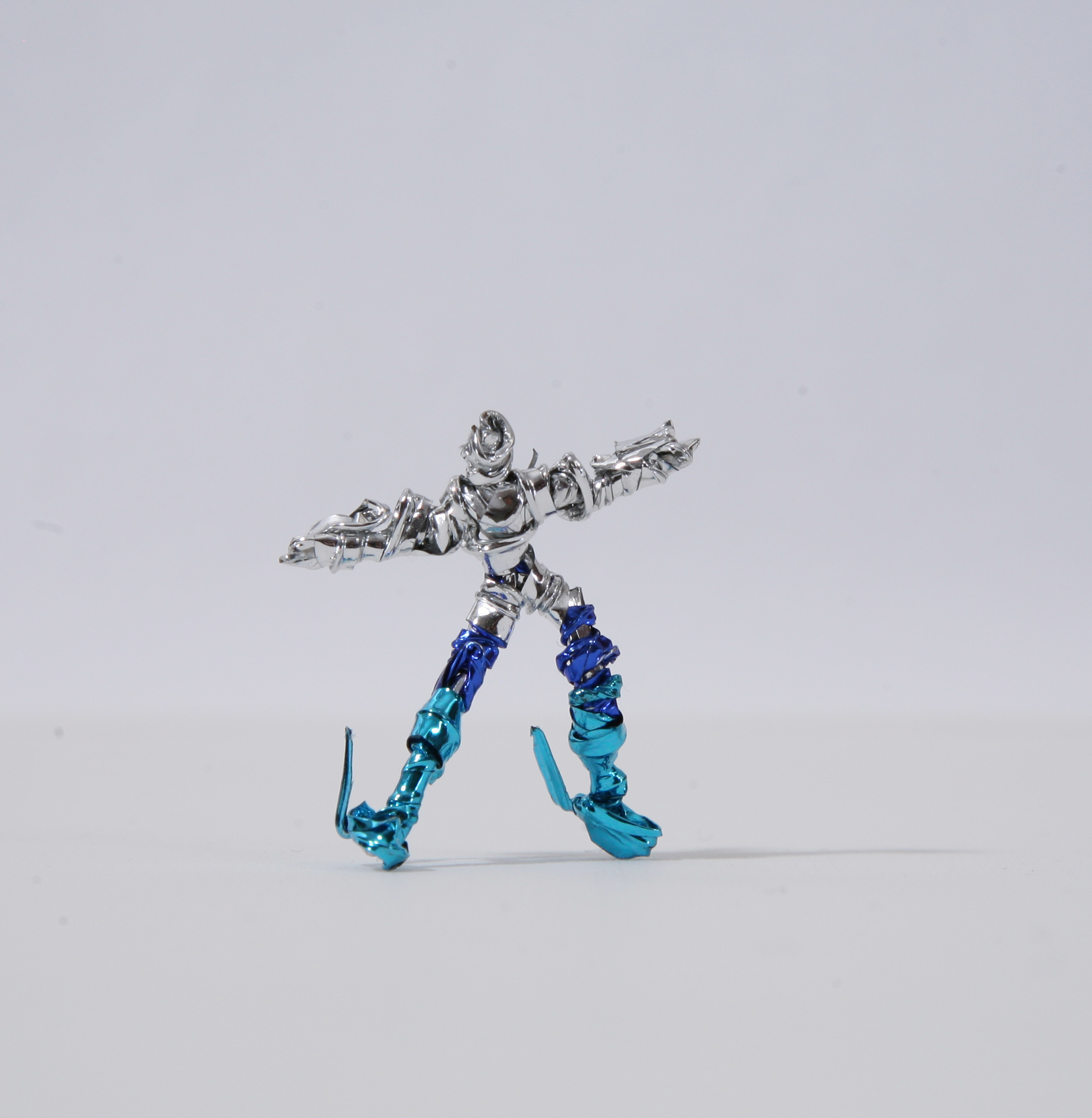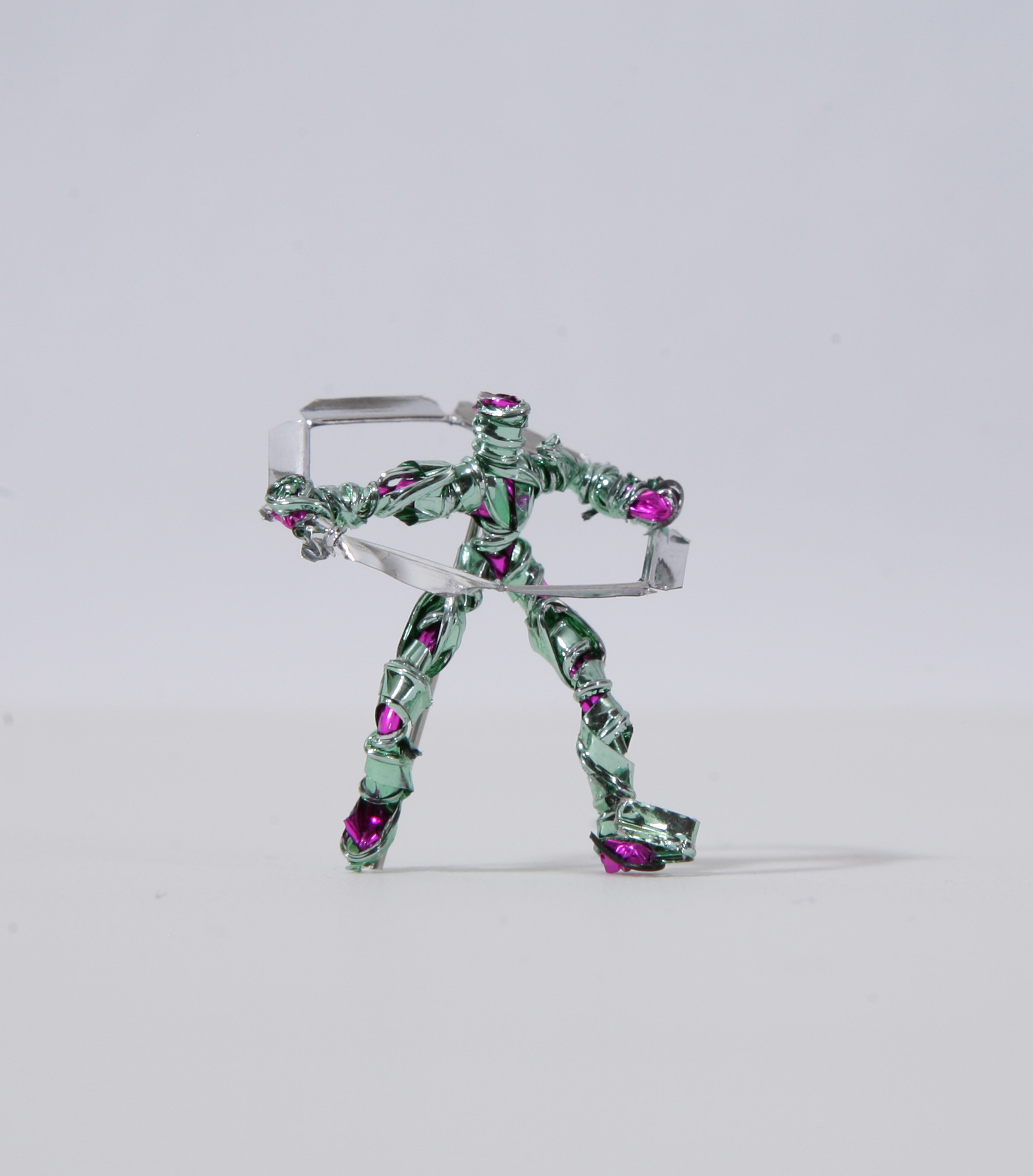 素材として用いられているのは、お菓子やパンの袋を留める際などに使われるアルミタイ。身近な素材を、思いもよらない方法で変換しながら、これまでに自宅で何百体もの戦士を生み出してきた。勝部の制作には、素材の特性を活かそうとする探求心と創意工夫が感じられる。