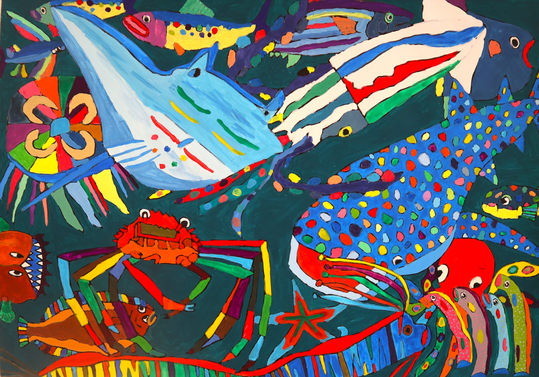 具体的モチーフの作品もあれば抽象的な作品もある。なんでも描いてこだわりがないように見えるが、それでも動物と海の生物だけは特別なのだろう。生き物たちへの深い共感、関心が伝わってくる。