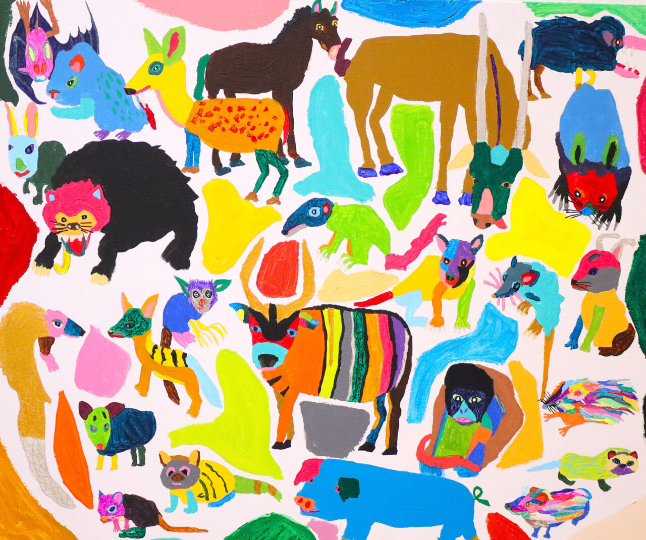 そんな佐藤の最新作が「世界のどうぶつ」だ。デフォルメされた形態と明るい色彩。ユーモラスで愛嬌がある動物たち。児童画のような率直さがある。