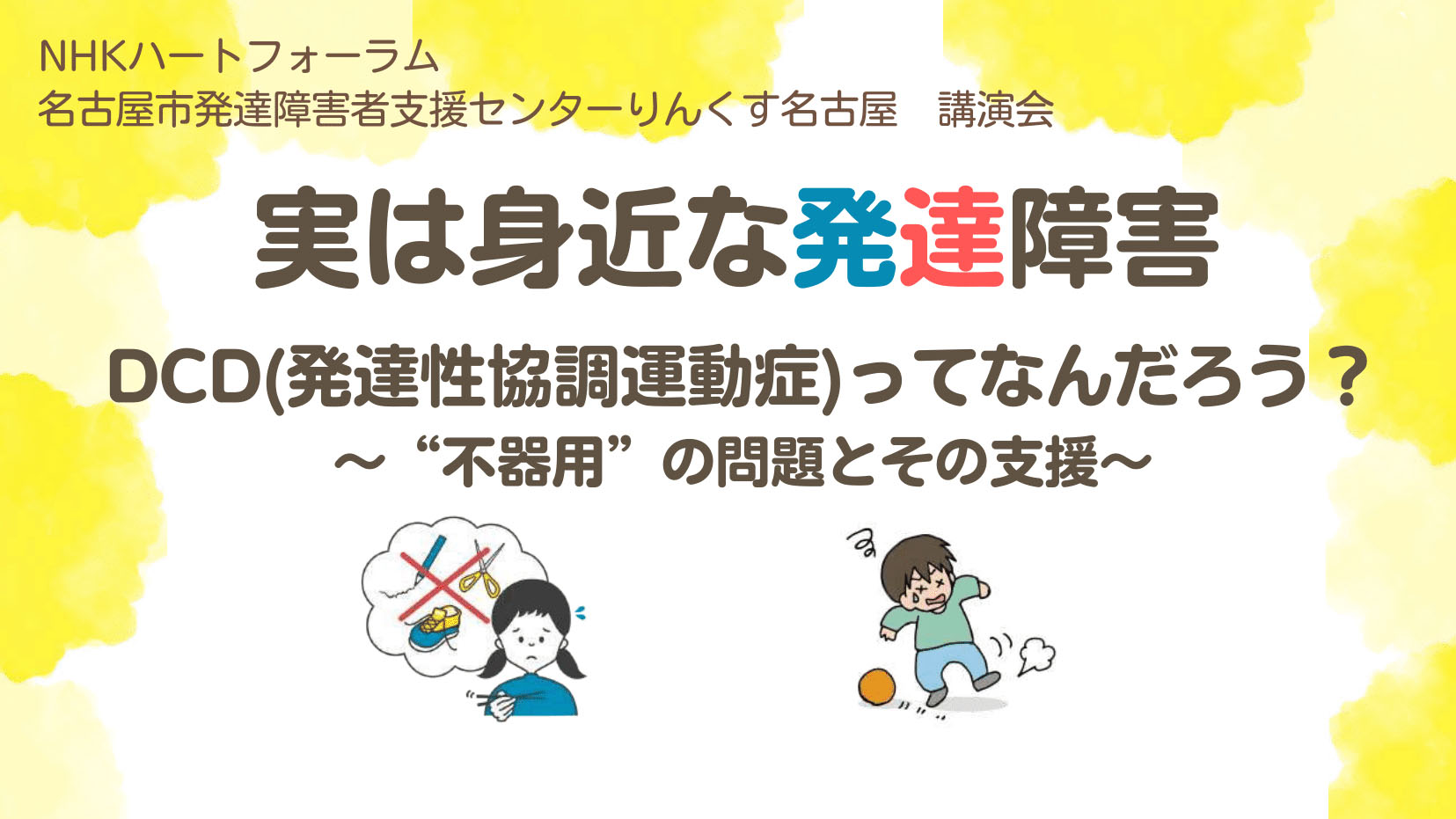 ハートフォーラム「実は身近な発達障害 DCD(発達性協調運動症)ってなんだろう?~”不器用”の問題とその支援~」NHKハートフォーラム(2月14日)を名古屋市で開催します 募集中