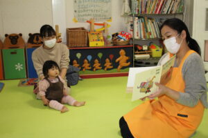 取材に訪れた日は、乳幼児と保護者同士が交流できる「おやこひろば」の日でした。この日は3組の親子が参加。保育士でもある鳥海さんが子どもたちと手遊びをしたり、絵本を読み聞かせたり。その後、子どもたちは自由におもちゃ遊びをして、その間に保護者同士は気兼ねなくおしゃべりを楽しんでいます。時には鳥海さんに子どものことを相談したりしていました。