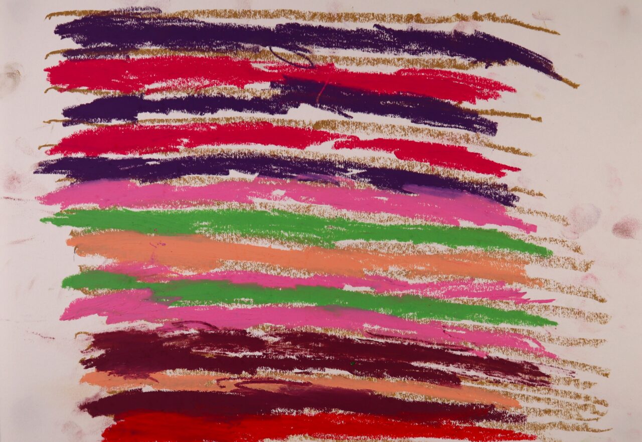 作品はケリーが通う施設「アール・ド・ヴィーヴル」で制作している。午前中はクレヨンで縦線(横線のときもある)を描き、それから間に色を塗っていくのがルーティン。午後はキャンバスや画用紙にアクリル絵の具や水彩で描く。筆圧が強いので、紙では同じところを繰り返し描いているうちに、すり減って繊維が剥けてくることもある。強度のあるキャンバスがケリーの特性には適している。筆や色の組み合わせも自分で選んで決め、だいたい一枚を6時間くらいで仕上げていく。大きいサイズの絵を描く時はことさらうれしそうな様子で、ニコニコ微笑みながら描いている。