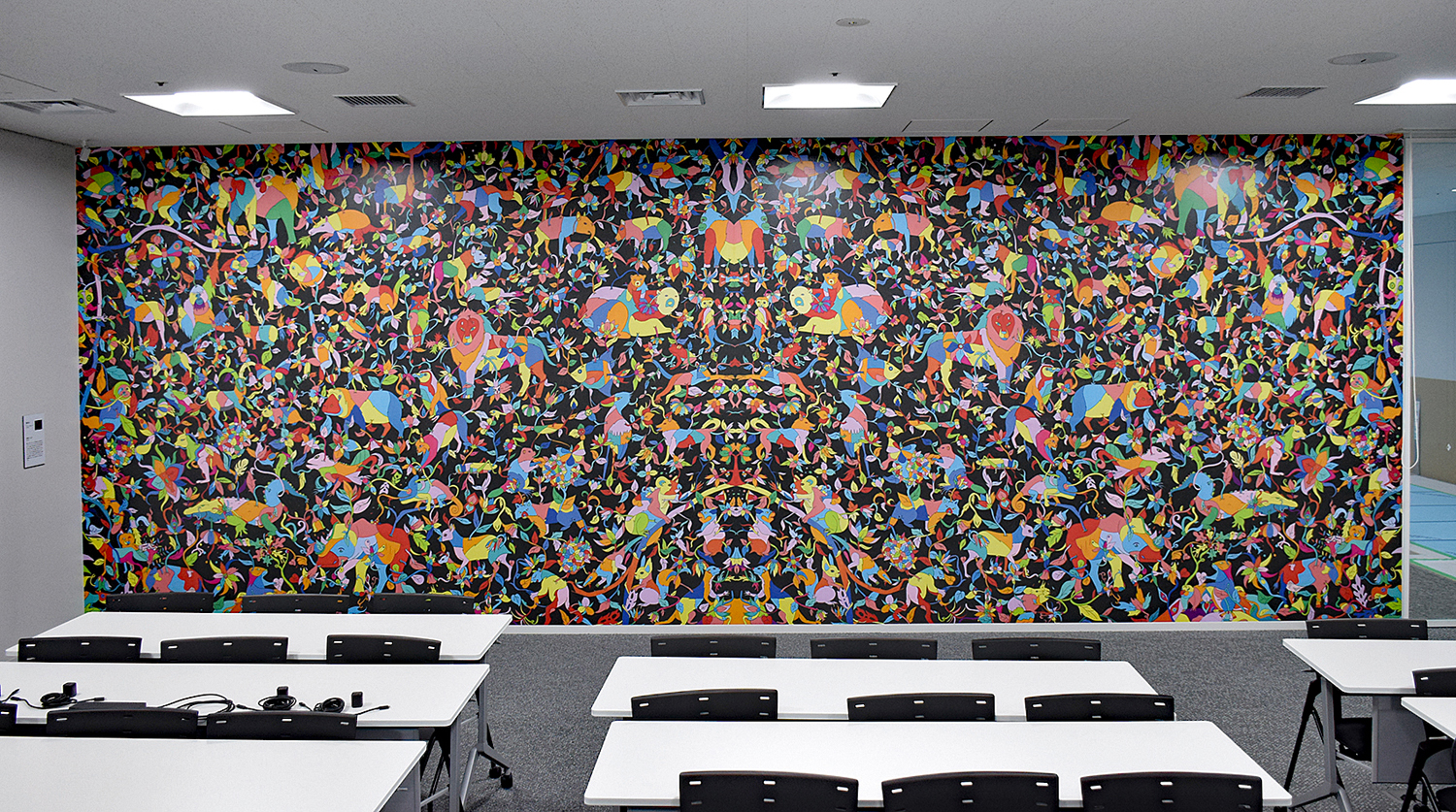 中野区役所新区庁舎(東京)の1階のミーティングルームに佐藤 朱美さんの作品が巨大なウォールアートとして壁紙のデザインに使用されました。