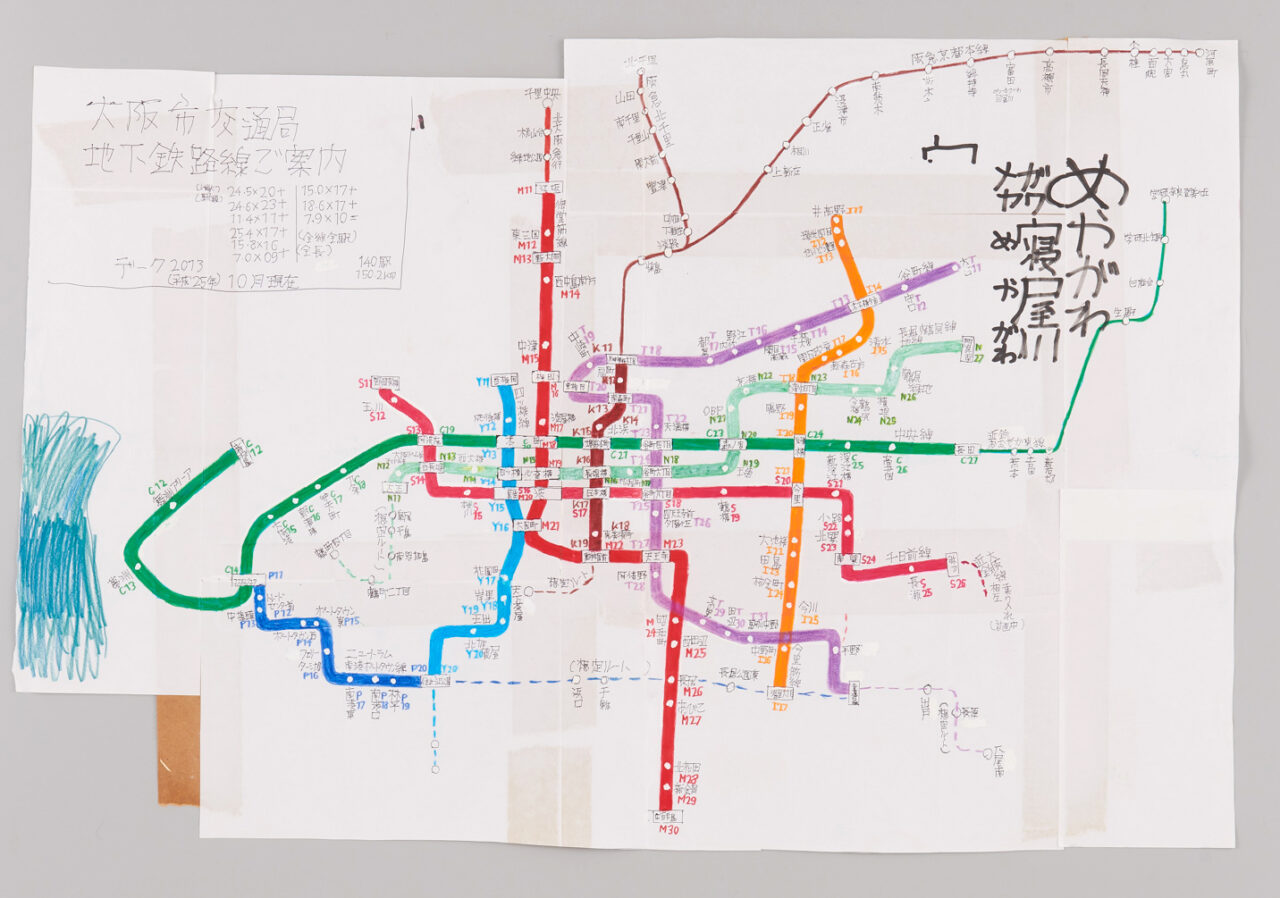 電車の路線図を描きだしたのは高校生くらいから。旅行雑誌の中の路線図や大阪市営地下鉄配布の路線図がお手本だ。なぜ大阪の地下鉄なのか?母親によれば明島は「大阪をこよなく愛している」から。ただし近鉄は範囲が広くてややこしいから描かないらしい。製作時間は2~3日程度。ほかに東京の路線図もあるが、そちらの制作時間は1週間ほどだそう。