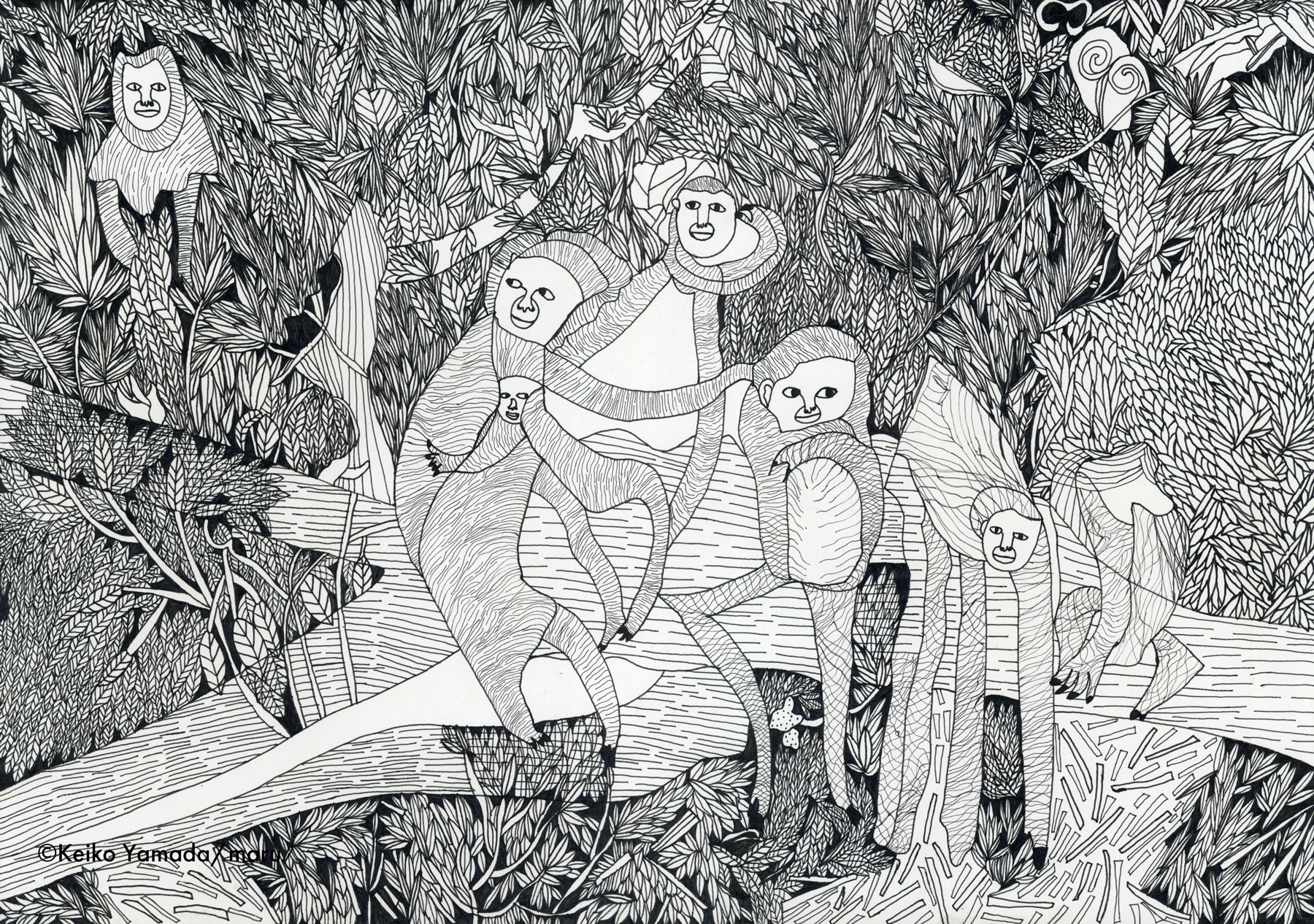 山田の絵画は「線」が始まりにある。線によって表現される動物や植物たち。いちばん心惹かれたのはモノクロームの作品だった。繊細な線と塗りつぶしの面が生む美しい空間。描き込みの密度と余白のバランスの音楽のように心地よいリズム。それだけではない。乾いたグラフィック感覚の中にどこか、ねっとりとした、得体のしれない“なにか”がノイズのように潜んでいる。
