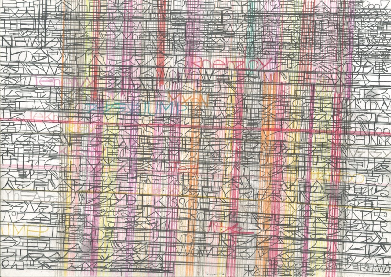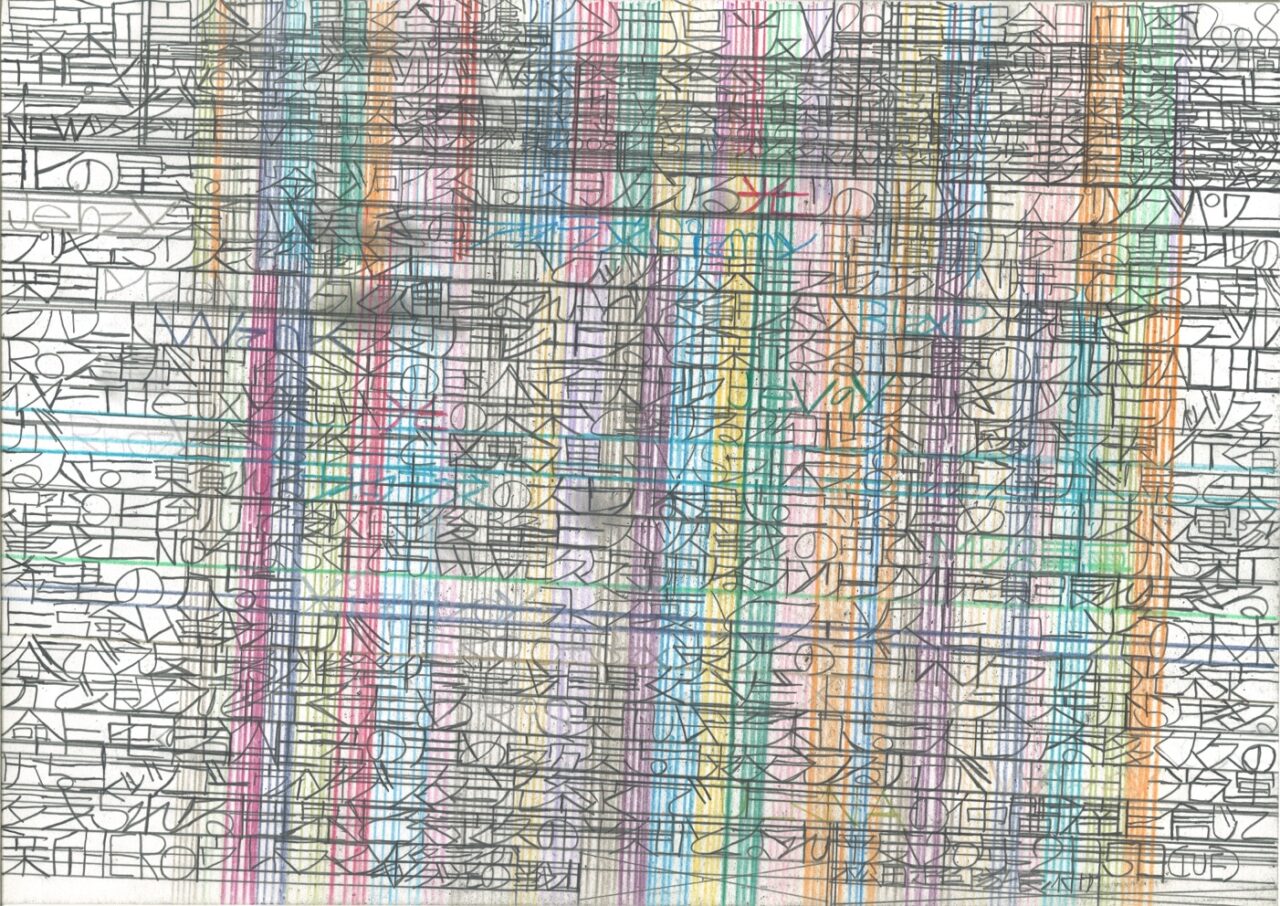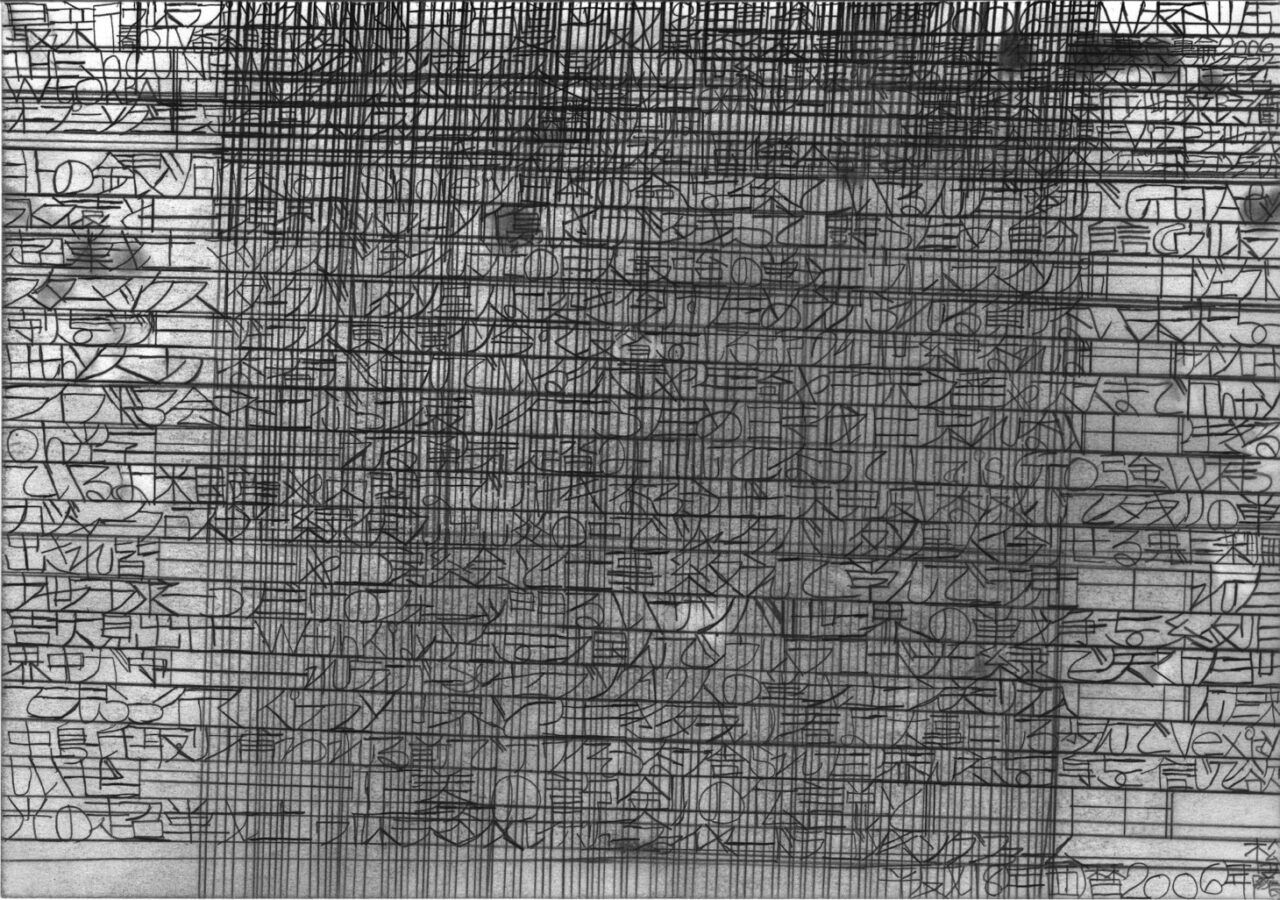 松田は社会の出来事に強い関心を寄せ、「地球防衛団隊長」として地球を見守り続けています。テレビやラジオ、新聞などのニュースを手がかりに着想を得て、主に鉛筆を用い、A4やB4のコピー用紙に縦横に線を走らせながら、地球の平和を願うメッセージを書き記しています。