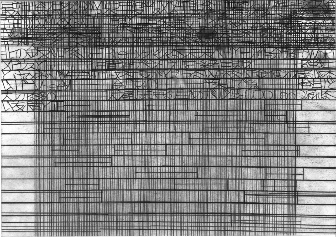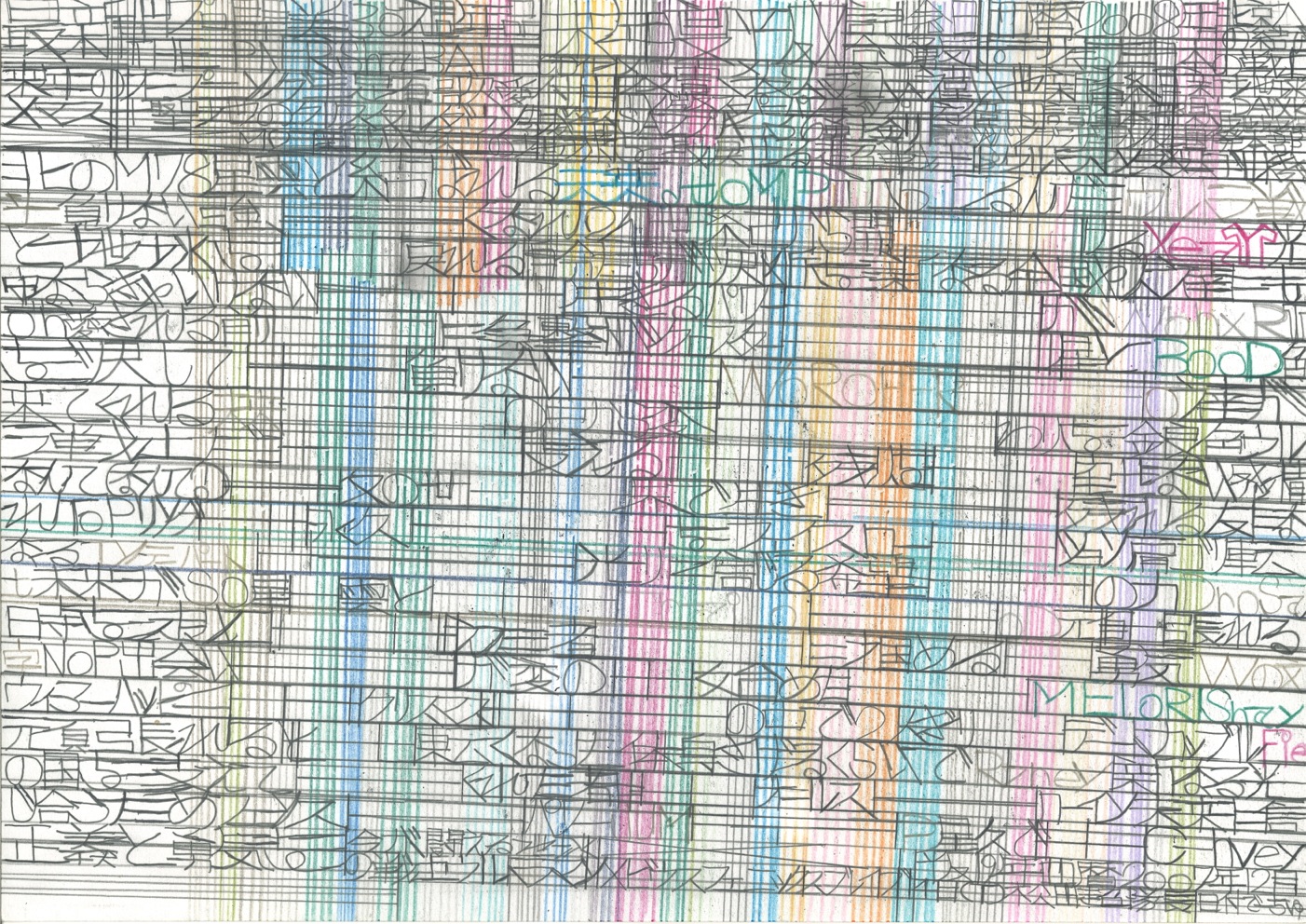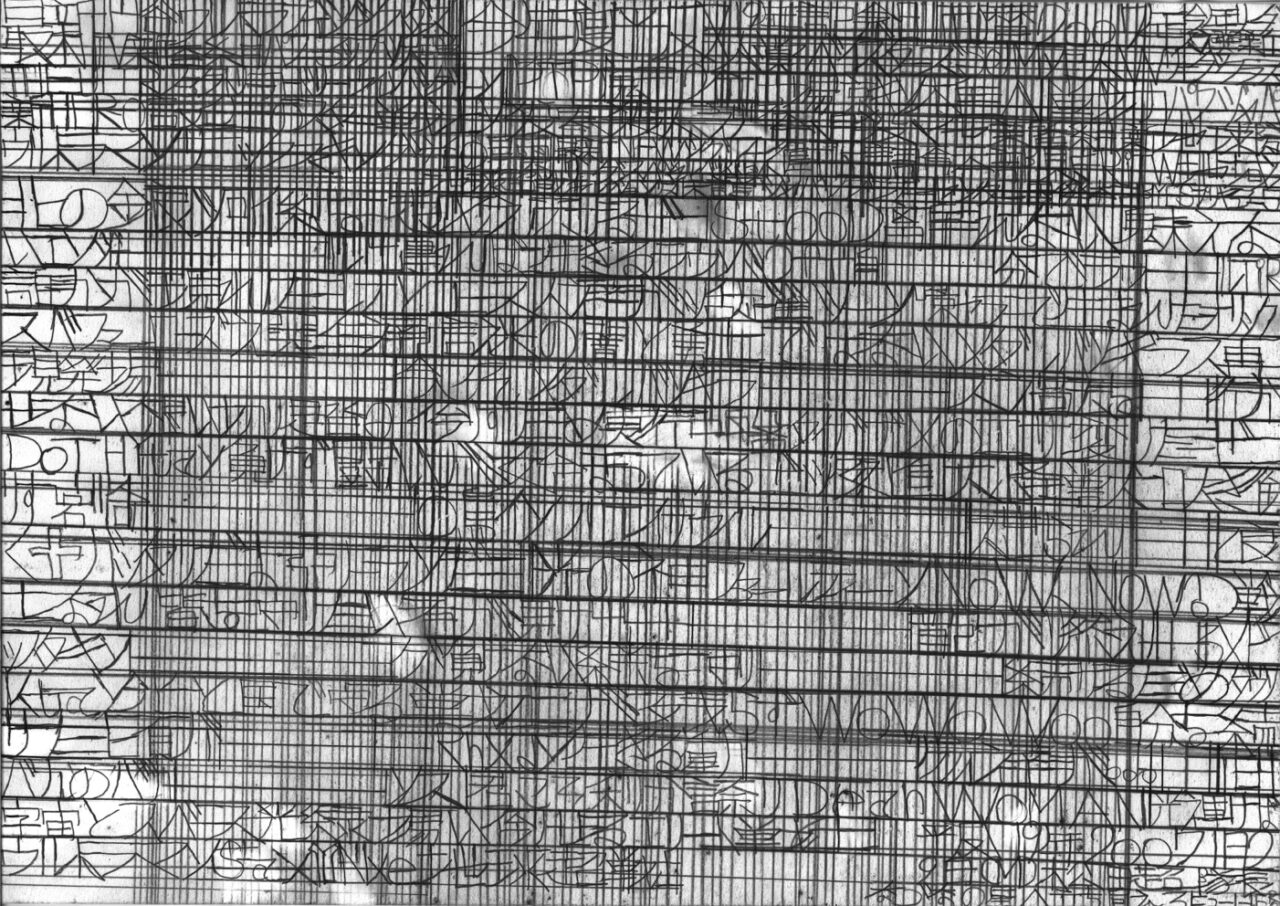 松田は社会の出来事に強い関心を寄せ、「地球防衛団隊長」として地球を見守り続けています。テレビやラジオ、新聞などのニュースを手がかりに着想を得て、主に鉛筆を用い、A4やB4のコピー用紙に縦横に線を走らせながら、地球の平和を願うメッセージを書き記しています。